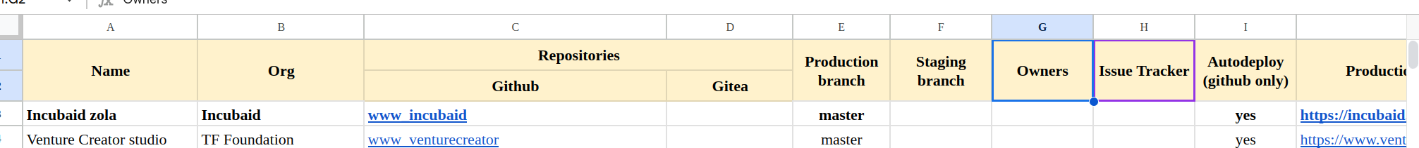 Let's put the info of all websites on the google spreadsheet you created, e.g. we can add a column Owner, issue tracker, and deployment CI/CD, branches protection, etc.